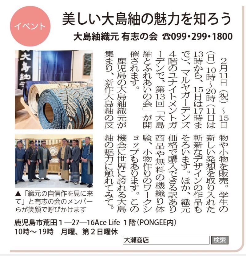 2/11(水)〜2/15(日)に、鹿児島市天文館マルヤガーデンズで鹿児島ひっとべの会(大島紬織元8社)でイベントを致します。