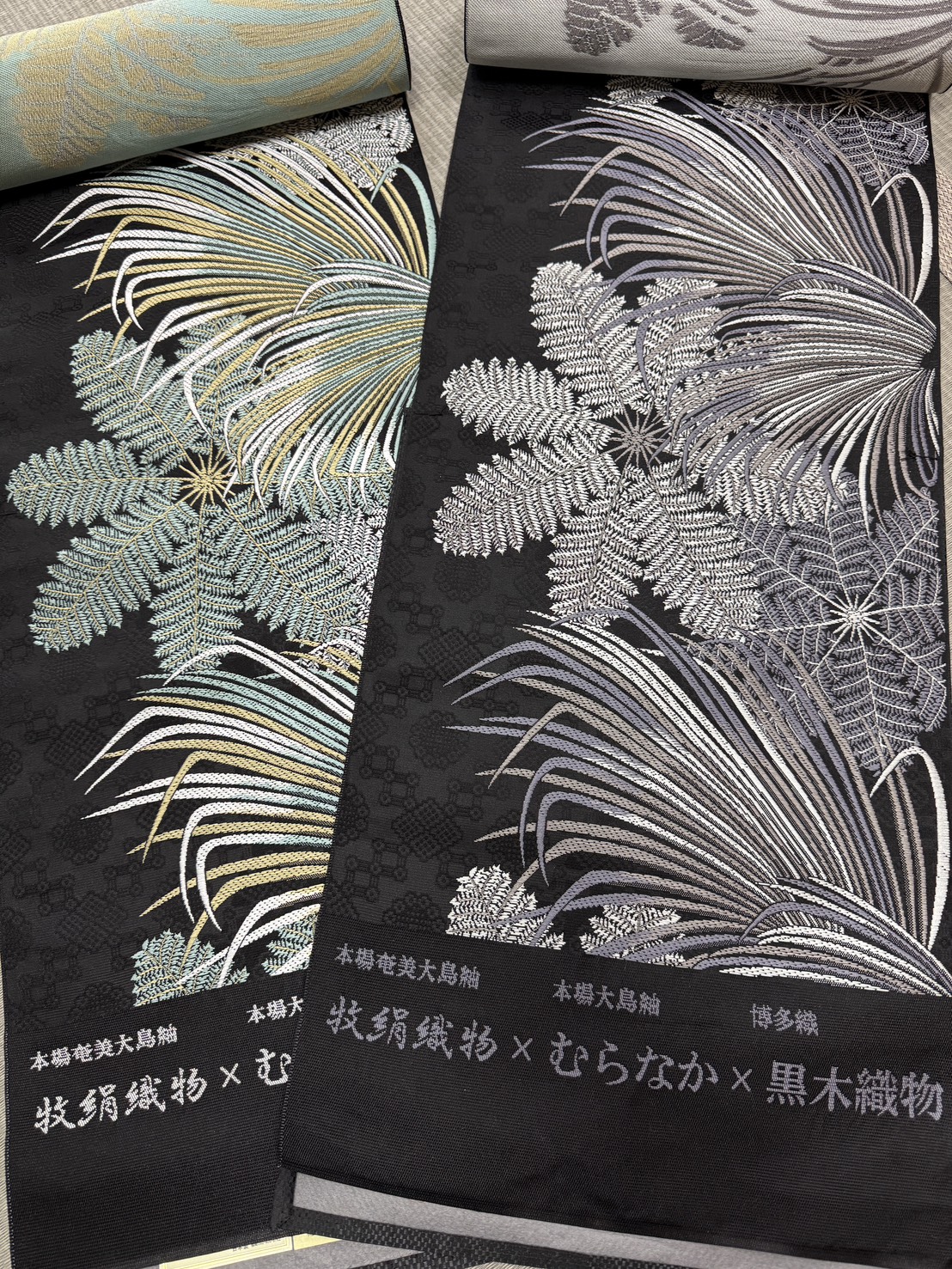 今回は、華やかな金×緑彩の配色と、シックなモノトーンの二配色で織り上げてもらいました。